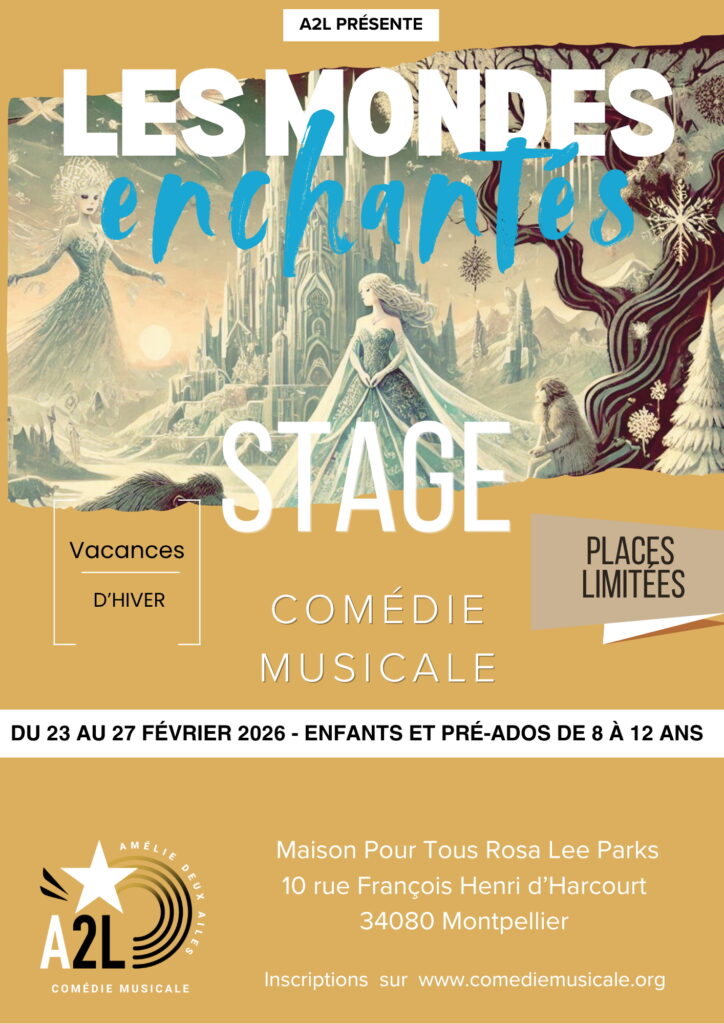 Le stage se clôturera par une représentation gratuite et ouverte aux parents et amis, où les participants joueront des scènes et des numéros inspirés de ces quatre univers enchanteurs, mettant en avant leur travail de la semaine, le vendredi à 14h30,suivi d’un goûter enchantée participatif.