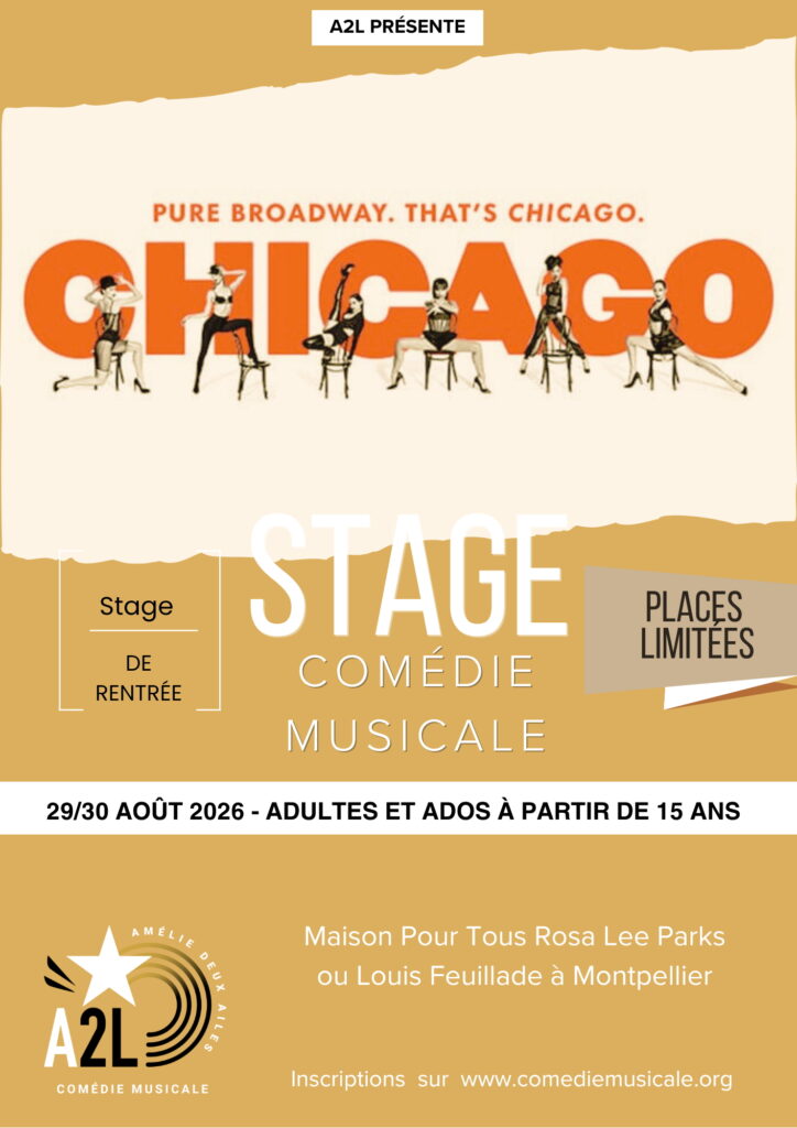 Plongez dans l’univers sensuel et irrésistiblement jazzy de Chicago, la comédie musicale culte qui a marqué l’histoire du Broadway des années 20. Pendant ce week-end, vous explorerez les chansons et rôles emblématiques de Roxie Hart, Velma Kelly et des autres stars de la scène de Chicago. Au programme : Travail vocal sur les chansons cultes pour révéler votre côté jazzy et envoûtant. Chorégraphies rythmées et sexy inspirées des classiques de Bob Fosse. Exploration de personnages iconiques et apprentissage du jeu scénique qui fait vibrer la scène. Exercices de style, attitude et présence scénique pour vous approprier l’esprit Chicago